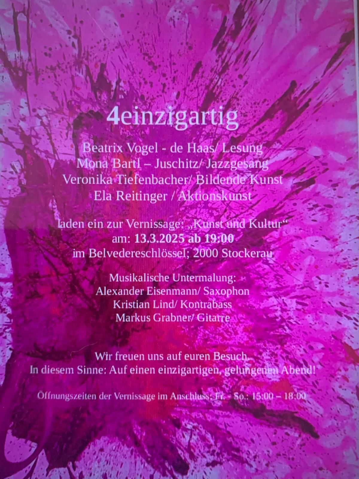 wir freuen uns auf Euch …MÖGLICHST UM ANMELDUNG bis Ende Mai 2026 unter „+43 (0)660 63 00 195“ & auch ganz besonders über eine Spende freier Wahl für den künstlerischen „KREATIVaufwand“ (JUN26)